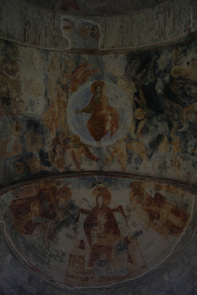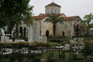 Another early start (left hotel at 8:15), very misty damp day, could barely see the sea. Drove to the Aya Sofia of Trabzon – on a promontory looking out to sea (and next to a school). Beautiful (though somewhat timeworn) frescos inside – similar style to those in Goreme, same artist. Tortoise asleep on the ground.