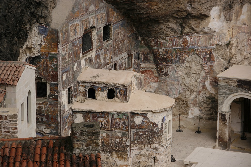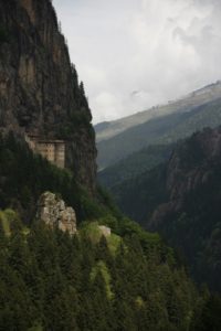 Next headed up into the very lush, green wooded hills to the Sumela Monastery, clinging to a cliff face. Drove beside very fast running, silty river (full of snow melt). Road to the monastery very narrow, very steep, very twisty. Met a cement lorry coming down, there was only just room for it to squeeze past. Rhodedendron (Ponticum – in the Pontic hills) growing amongst the trees. Monastery at approx 1300m.