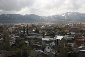 Stopped at a cafe just down the mountain for lunch (very good lentil soup, and slightly spicy beef stew). Then drove to Erzurum (arrival 7:30). Initially through more wooded mountains (almost Alpine looking – till you see the mosque and minaret in each village). Went (almost) over a pass (through a tunnel just before we got to the top), came out to stunning views of snow-covered mountains. Not so many villages the other side of the pass. Held up at roadworks (road under construction).