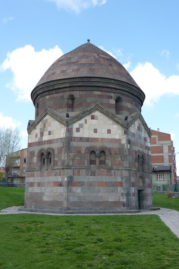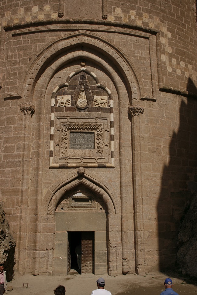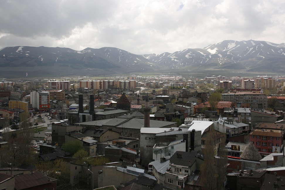 Breakfast in the hotel (not buffet, already laid out on tables), then left at 9am for a walking tour of Erzurum. Visited the Twin Minaret Medress (closed for restoration), the Three tombs and the Citadel. Houses in this part of town are being demolished so the area can be coverted to a historical park. Citadel built of local volcanic rock. It retains the heat well. City surrounded by mountains. WW1 fort visible on an adjacent hill.