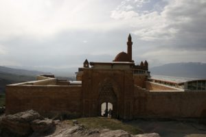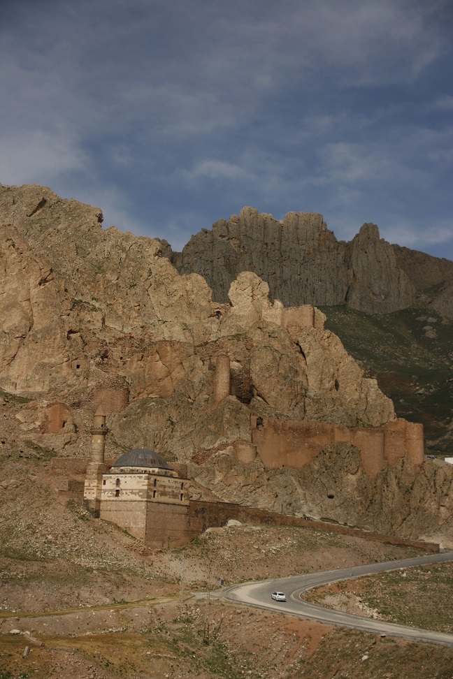 Carried on to Dogubeyazit, with wonderful views of Mt Ararat (top shrouded in cloud). Landscape very dramatic, craggy and with wonderful coloured rock strata. Passed through the town, went up to the Ishak Pasha Palace, perched on a crag part way up a pass into Iran (very close to the border). Big military base in town, tank repair and training apparently (had passed a few armoured personnel carriers on the road).