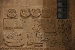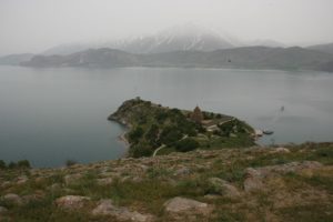 Reached the island and disembarked. Small owl perched in a tree. Walked a short distance to the Church of the Holy Cross – 10th century Armenian church, with very beautiful carvings of biblical scenes round the (external) walls. Badly worn frescos inside the church. The ground outside was still covered in almond blossom. Climbed to the highest point of the island (bit of a scramble), saw a black snake. Returned to the mainland for lunch (yoghurt soup and delicious beef stew, with hot peppers). Drove to Tatvan (2 hrs). Part of the drive was by the lake, part through the mountains. Passed many small villages (many surrounded by trees just starting to blossom), also a police checkpoint.
