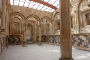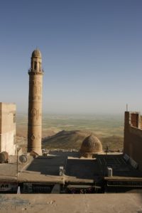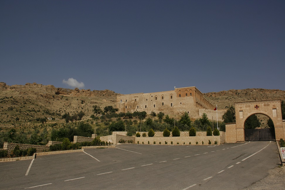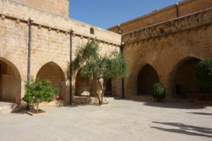Carried on to Dar-es-Zafran (Saffron Monastery – due to the crocuses that grow on the hillsides). Dates from 5th century AD, Syrian Orthodox (Aramaic), on the site of a 4000 year old fire temple (remains visible in the basement). Very beautiful (and original) carvings on the arches in the church. Services are still held three times a day, in Aramaic. Two wells in the courtyard, where the monastery still gets its water. Lots of olive trees round the monastery.