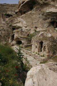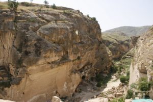 Remains of an Ottoman bridge visible in the river (village was an important stop on the Silk Route) – it was a ‘double decker’ bridge with a lower passage for camels and an upper one for people. Lots of buildings carved in the rock, including a mint with a stairway cut into the rock. Tour with a local guide, whose grandparents died in one of the cave houses at over 100 years old. Storks nesting on top of the minaret. Kurdish wedding party touring the site, very smartly dressed women chanting.
