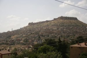 Walked into town, back to the Pools and up to the Citadel. Very hot and sweaty, lots of steps! Good view of Urfa (not a very attractive town) from the top. Exit is via a passageway cut down through the rock – steps a bit worn, and dark after the bright sun. We did wonder if they actually went to the exit – but they did! Went to the bazaar and (with difficulty) found the kilim shop and bought some kilims. Returned to the hotel, bought some soft drinks and sat on the roof terrace.