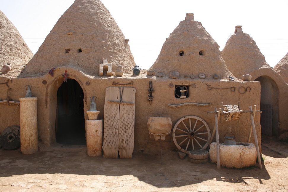 Stopped in the village, picked up a local guide. Saw the ruined mosque (tower is now 30m high, used to be 72m, was used for astronomy). Camel grazing in the distance. Saw the Aleppo gate in the city walls. Visited a village house – beehive shaped single rooms (interconnected), around a central yeard. ‘Beehives’ made of rocks covered with mud, with the cone made of shaped stones – cool in summer, warm in winter. Had tea in the yard, moved on to view the castle, still an impressive structure. Hoopoe flying about outside.