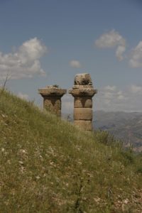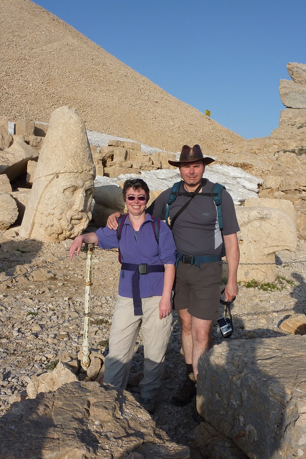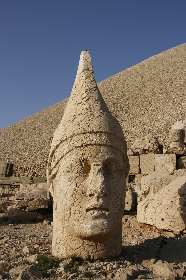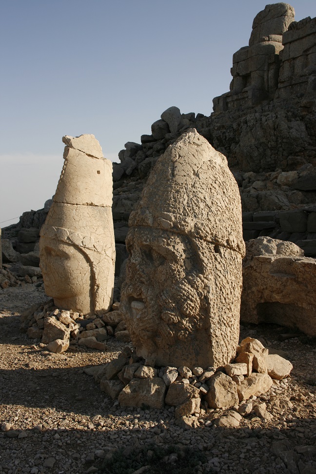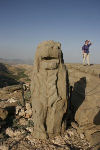 Next headed to Nemrut Dagi itself, back on the twisty mountain roads. Arrived at the carpark, and tackled the path up the mountain. Not a long (600m?) or steep (150m?) path, but quite rough, and an effort at 2000m! Arrived at the East Terrace, this has an altar plus a row of thrones and seated torsos (heads on the ground in front of them). Moved on to the West Terrace (via the North Terrace – not much to see here) – similar to the East Terrace, but no altar and thrones. Settled down to watch the sunset (more and more people arriving all the time). Not allowed to climb the tumulus itself (someone did, and a guard whistled and shouted).