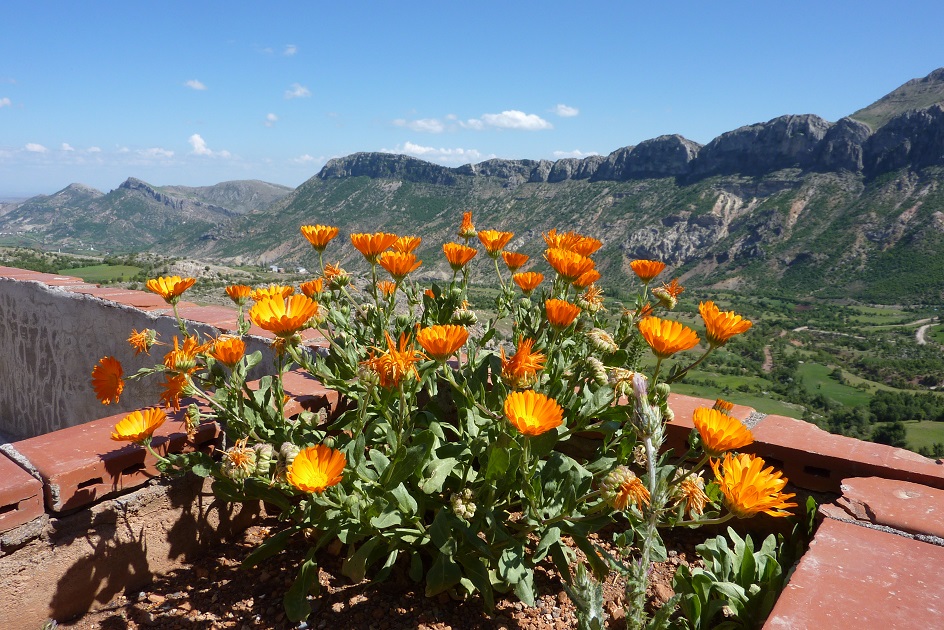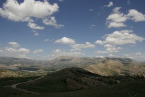 Headed into the mountains towards Nemrut Dagi, through various small and impoverished-looking villages. Stopped at Mount Euphrat Hotel – fantastic situation, terrace with views across the valley to the escarpment opposite. Unfortunately only three rooms ready (rest of hotel being renovated), so most of the group had to go back down the valley to an alternate hotel in the next village (same owners). Blue flowers and trees with white flowers (acacia?) around the hotel. Saw buzzards, a hawk, swallows, and hoopoes while sitting on the terrace (free drinks and evening meal provided as apology for the lack of rooms).